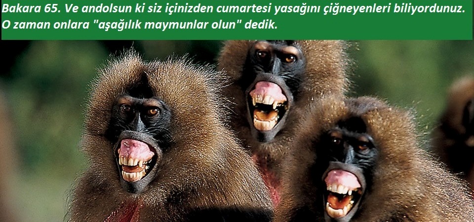 “İçinizden cumartesi günü haddi aşanları elbette bilmektesiniz. İşte onlara: “Aşağılık maymunlar olun!” dedik. Bunu, hem bu olaya şahit olanlara hem sonradan geleceklere ibret, takva sahiplerine de bir öğüt kıldık.” (Bakara :65-66)