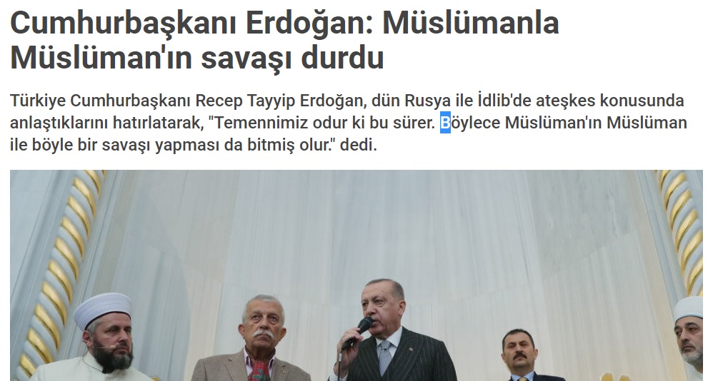 Dün Rusya ile İdlib’de ateşkes konusunda anlaştıklarını hatırlatarak, “Temennimiz odur ki bu sürer. Böylece Müslüman’ın Müslüman ile böyle bir savaşı yapması da bitmiş olur.” dedi.