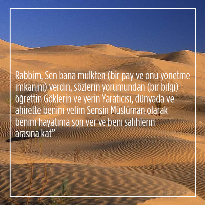 “Ey Rabbim! Bana nüfuz ve iktidar bahşettin; olayların altında yatan gerçekleri kavrayıp açıklama bilgisi verdin. (Ey) göklerin ve yerin yaratıcısı! Dünyada ve ahirette benim yanımda yakınımda olan/beni koruyup destekleyen Sensin: canımı, bütün varlığıyla kendini Sana adamış biri olarak al ve beni dürüst ve erdemli insanların arasına kat!” (Yusuf:101)