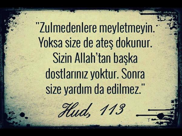 “Zulmedenlere meyletmeyin (sevgi beslemek, yağcılık yapmak veya yaptıkları işlere rızâ göstermek suretiyle); sonra size ateş dokunur. Sizin Allah’tan başka dostlarınız yoktur. Sonra size yardım da edilmez.” (Hud:113)